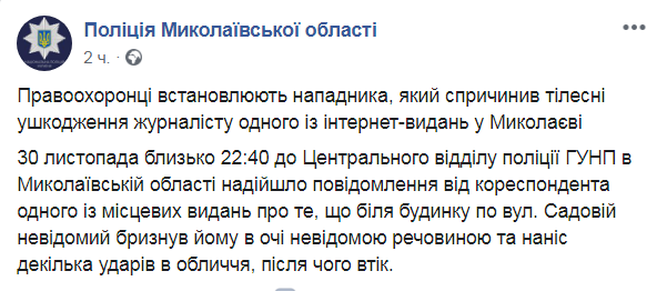 Полиция Николаева разыскивает неизвестного, который вечером 30 ноября нанес телесные повреждения журналисту одного из местных интернет-изданий Александру Влащенко. Об этом сообщается в Facebook полиции Николаевской области.