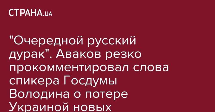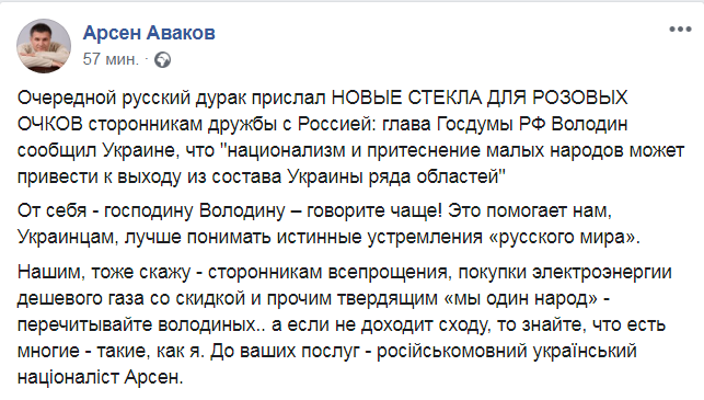 "Очередной русский дурак прислал новые стекла для розовых очков сторонникам дружбы с Россией: глава Госдумы РФ Володин сообщил Украине, что "национализм и притеснение малых народов может привести к выходу из состава Украины ряда областей". От себя - господину Володину: говорите чаще! Это помогает нам, украинцам, лучше понимать истинные устремления "русского мира", - написал Аваков.