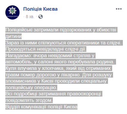 Напомним вчера неизвестный стрелял в автомобиль, в салоне которого находилась семья. Пуля попала в мальчика, который от полученных травм скончался по дороге в больницу. Для розыска злоумышленников в Киеве проводили специальную полицейскую операцию. Все детали задержания правоохранители сообщат позже.