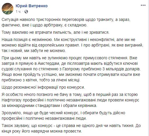 Директор группы НАК "Нафтогаз Украины" Юрий Витренко завтра едет в Амстердам, столица Нидерландов, где 4 декабря состоится ключевое заседание суда по взысканию долга с российского ПАО "Газпром". Об этом он написал в своем Facebook.