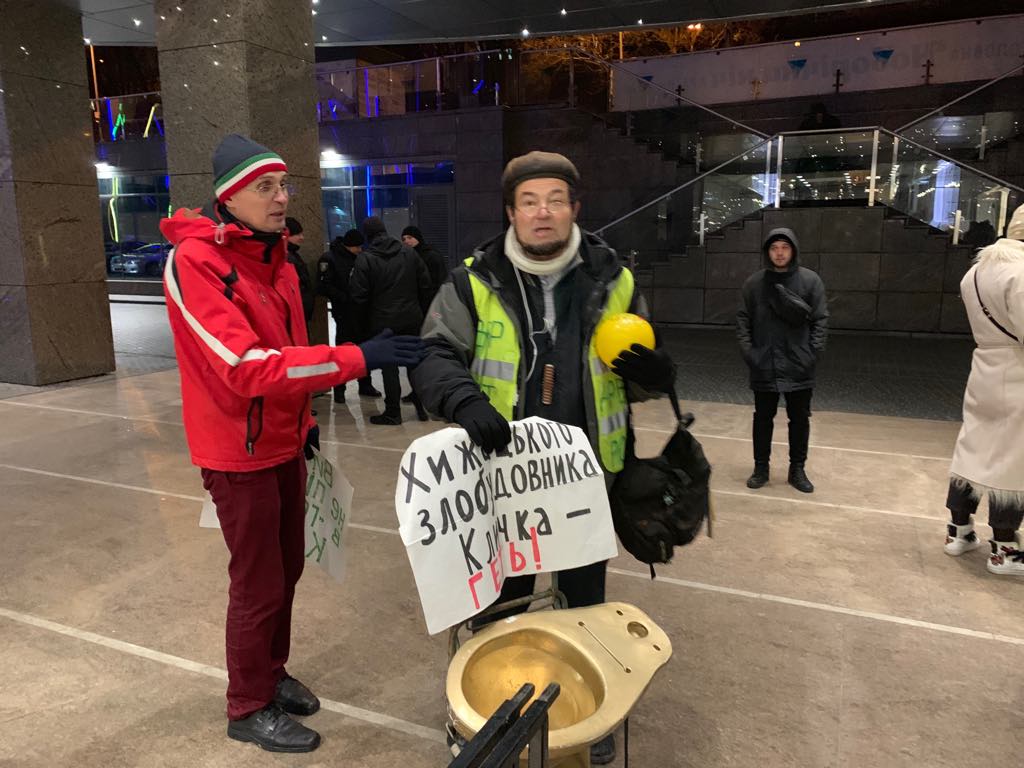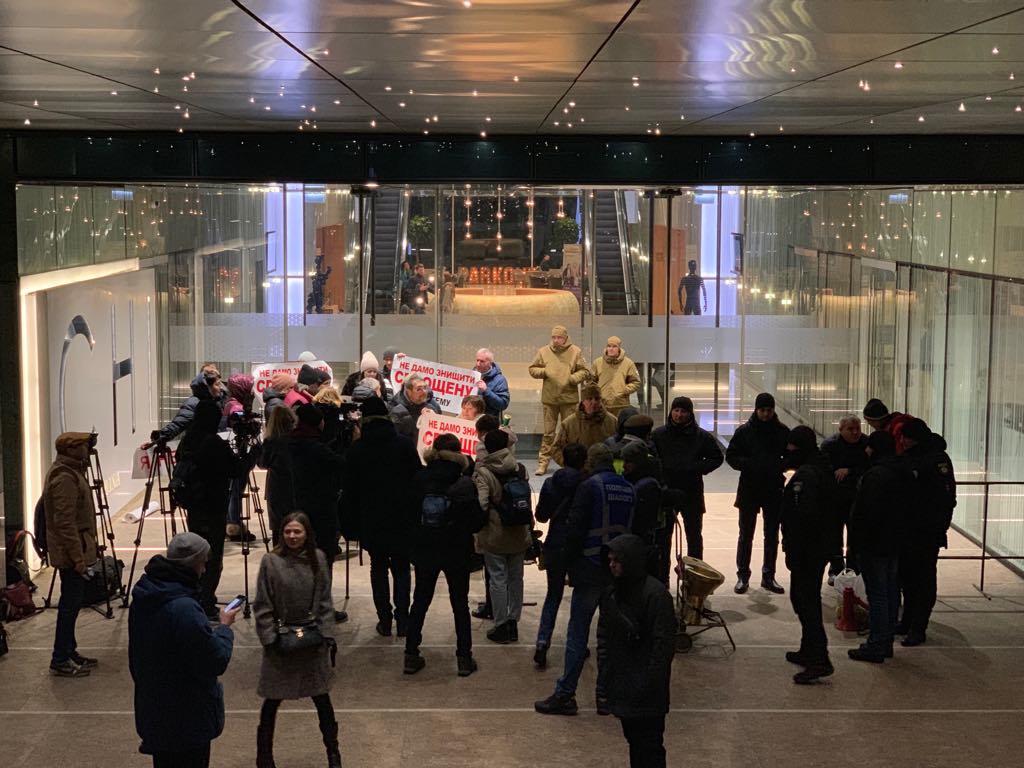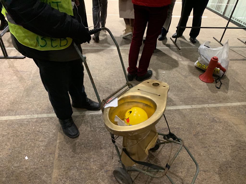 В Киеве в КВЦ "Парковый", где должно состояться заседание фракции "Слуга народа", проходит акция протеста, один из участников которой принес с собой золотой унитаз, символизирующий коррупцию. Об этом сообщает корреспондент "Страны".