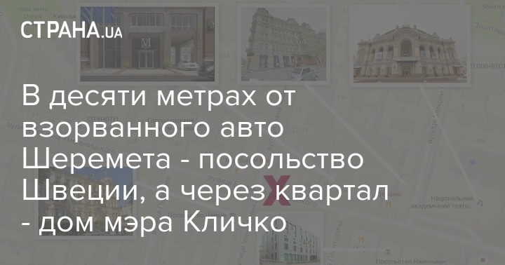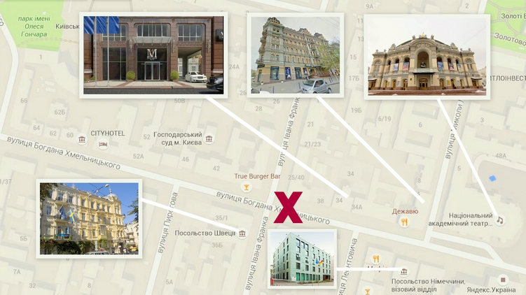 Улица Богдана Хмельницкого в Киеве очень оживленная и днем и ночью. На ней находится множество учреждений и заведений. Ближе всего к месту ЧП расположено Посольство Швеции, буквально в десяти шагах. Еще 150 метров разделяет смертельный перекресток и Посольство Словении. 200 метров до Посольства Германии. Там же через дорогу находится дом мэра Виталия Кличко. Напомним, его апаратаменты расположены в высотке с видом на Национальный оперный театр и саму улицу Хмельницкого. Интересно, что гостиница 11 Mirrors, которая принадлежит младшему из братьев Кличко, стоит в 130 метрах от точки взрыва. На таком же расстоянии, но по улице Франко расположено Министерство культуры, а в 250 - Посольство Австрии. Кстати, неподалеку есть станция скорой помощи и Поликлиника №1 - до них всего один квартал.