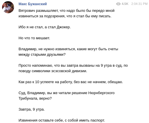 "Владимир, не нужно извиняться, какие могут быть счеты между старыми друзьями? Просто напоминаю, что вы завтра вызваны на 9 утра в суд, по поводу символики эсэсовской дивизии. Как раз к 10 успеете на работу, без вас не начнем, обещаю. Суд, Владимир, вы же читали решение Нюрнбергского Трибунала, верно? Завтра, 9 утра. Извинения оставьте себе, с собой иметь паспорт" - написал нардеп.