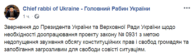 Главный раввин Украины и Киева Моше Реувен Асман обратился к президенту Украины Владимиру Зеленскому и парламенту с просьбой доработать проект закона №0931, чтобы не допустить ограничения конституционных прав граждан. Копию обращения религиозный деятель опубликовал в своем Facebook.