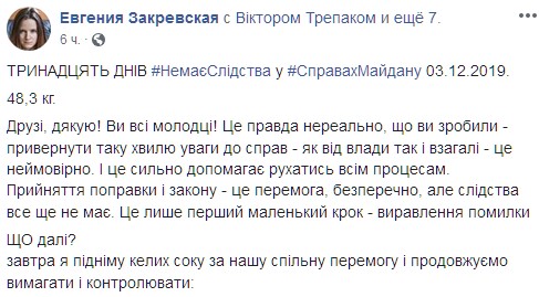 Адвокат семей Героев Небесной сотник Евгения Закревская заявила, что прекращает голодовку из-за того, что парламент принял поправку к закону о ГБР, которая позволяет возобновить расследование. Об этом она сообщила в Facebook.