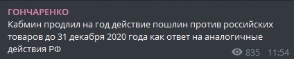 "Кабмин продлил на год действие пошлин против российских товаров - до 31 декабря 2020 года - как ответ на аналогичные действия РФ", - написал Гончаренко.
