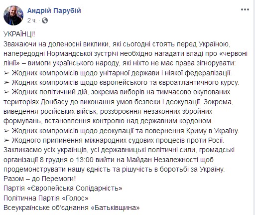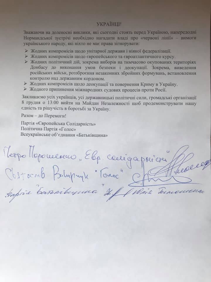 "Украинцы! Учитывая судьбоносные вызовы, которые сегодня стоят перед Украиной, накануне Нормандской встречи необходимо напомнить власти о "красных линиях" - требованиях украинского народа, которые никто не имеет права проигнорировать", - говорится в опубликованном обращении.