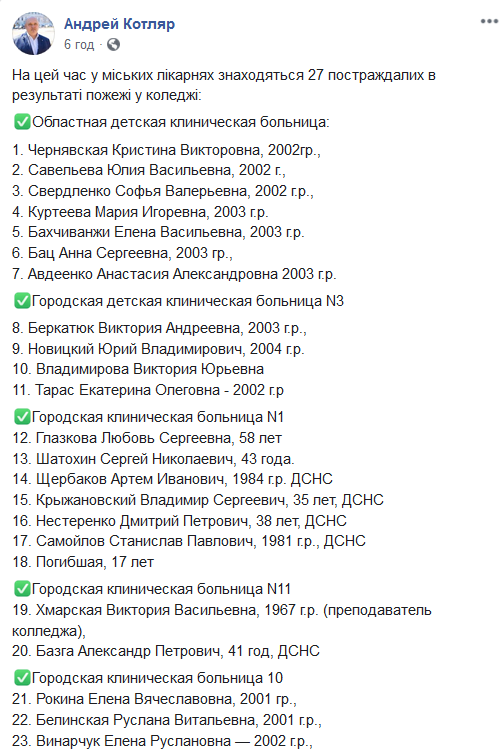 Одесса в шоке от пожара в колледже экономики и права, который разыгрался вчера 4 декабря. Андрей Котляр, заместитель мэра города привел полный перечень пострадавших во время масштабного ЧП. Печальный список он привел в своем Facebook.