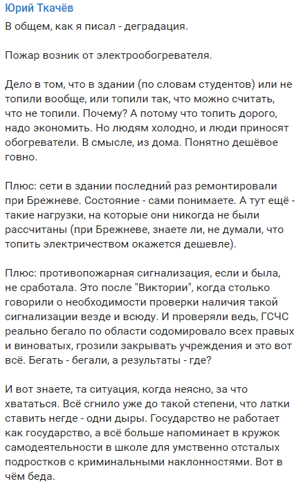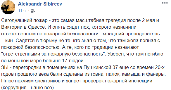 "Сегодняшний пожар - это самая масштабная трагедия после 2 мая и Виктории в Одессе. И опять сядет лох, которого назначили ответственным по пожарной безопасности - младший преподаватель ...кин. Садятся в тюрьму не те, кто знал о том, что там жопа полная с пожарной безопасностью. А те, кого по традиции назначают "ответственными за пожарную безопасность". Уверен, что там погибло по меньшей мере больше 17 людей.... ЗЫ - перегородки в помещениях на Пушкинской 37 еще со времен 20-х годов прошлого века были сделаны из говна, палок, камыша и фанеры. Плюс п...зм электриков и запрет проверок пожарной инспекции (коррупция - наше все)", - пишет в Facebook собкор "Страны", одессит Александр Сибирцев.