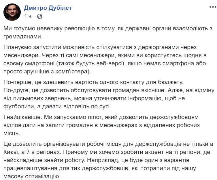 В Кабмине планируют открыть возможность общения граждан с государственными органами через интернет-чаты. Об этом говорится на fb-странице министра Кабинета министров Украины Дмитрия Дубилета.