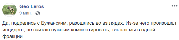 Лерос подтвердил факт драки. "Да, подрались с Бужанским, разошлись во взглядах. Из-за чего произошел инцидент, не считаю нужным комментировать, так как мы в одной фракции", - написал он в Facebook.