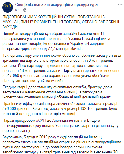 "Бывшему директору департамента фискальной службы, брокеру, двум заместителям начальника столичной таможни, а также двум инспекторам столичной таможни избран ночной домашний арест. Работнику офиса организатора преступной схемы - залог в размере 576,3 тыс. грн. Кроме того, залог в размере 192,1 тыс. грн был избран и для одного из инспекторов таможни", - говорится в сообщении.