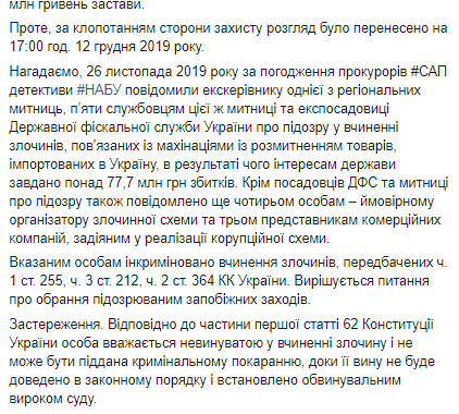 Кроме того, 5 декабря в суде апелляционной инстанции начато слушание апелляционной жалобы на решение ВАКС о применении к Альперину меры пресечения в виде содержания под стражей с внесением 70 млн грн залога. Однако по ходатайству стороны защиты рассмотрение было перенесено на 17:00. 12 декабря 2019 года.