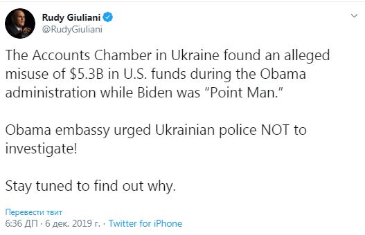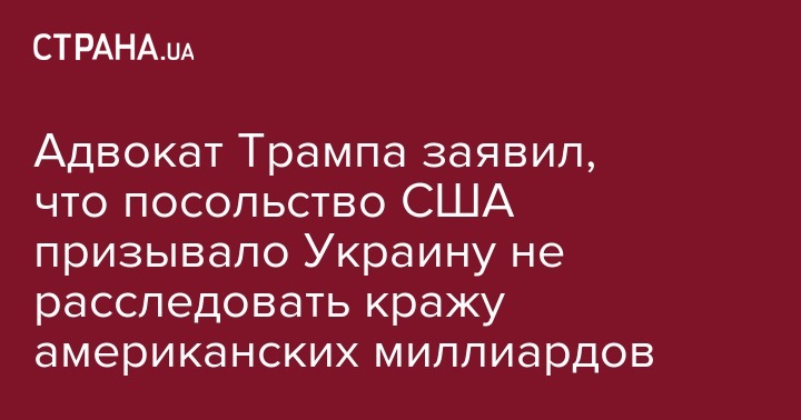 Адвокат американского президента Дональда Трампа Рудольф Джулиани заявил, что Счетная палата Украины выявила нецелевое использование многомиллиардной помощи США, но американское посольство призывало не расследовать это дело. Об этом Джулиани написал в своем Twitter.