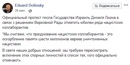 "Официальный протест посла Государства Израиль Джоеля Лиона в связи с решением Верховной Рады отметить юбилеи ряда нацистских коллаборантов: