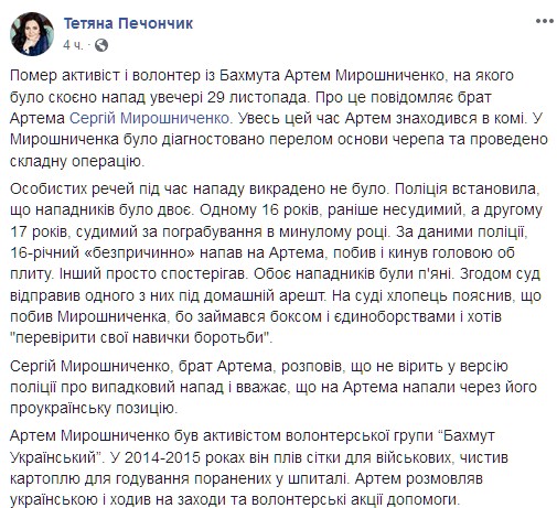 "Умер активист и волонтер из Бахмута Артем Мирошниченко, на которого было совершено нападение вечером 29 ноября. Об этом сообщает брат Артема Сергей Мирошниченко. Все это время Артем находился в коме. У Мирошниченко был диагностирован перелом основания черепа и проведена сложная операция", - сообщила она.