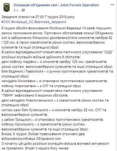 "6 декабря вооруженные формирования Российской Федерации 14 раз нарушили режим прекращения огня. Боевые травмы получили два военнослужащих Объединенных сил", - говорится в сообщении.