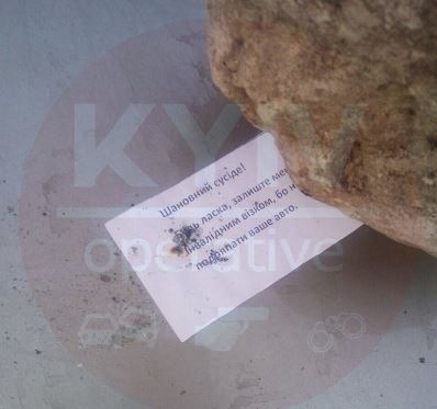 Киевлянин неправильно припарковался и получил записку с камнем на капоте. Фото