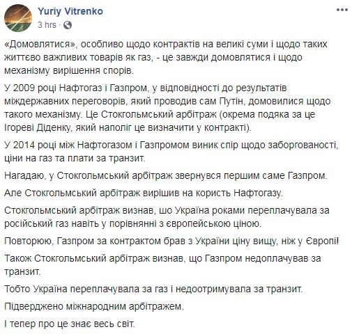"Забыть о невыполнении договоренностей со стороны Газпрома, простить Газпрому 3 миллиарда долларов, и забрать исковые требования в новом арбитраже без адекватной компенсации явояется невозможным вариантом. При этом теряется смысл любых новых договоренностей. Ну как договариваться со стороной, которая не выполняет свои договоренности и не хочет нести за это ответственность?", - отметил Витренко.