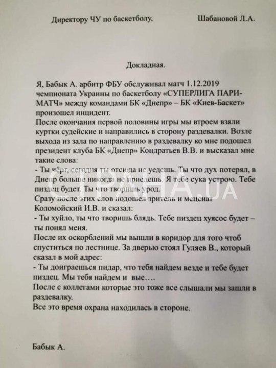 В документе арбитр указывает, что он по завершении матча отправлялся вместе со своими коллегами-судьями в раздевалку. Возле выхода из зала к нему подошел с угрозами Кондратьев. После этого на Бабыка начал "наезжать" Игорь Коломойский.