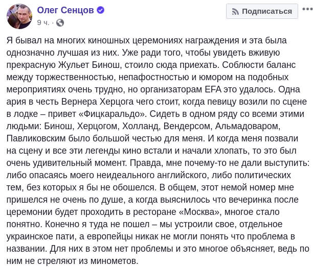 Украинский режиссер Олег Сенцов, который недавно призвал не возвращать Донбасс в Украину, пока Путин у власти, раскритиковал Европейский киноприз (European Film Awards, EFA, часто называют "еврооскар" - Ред.) в Берлине за то, что ему не дали слово во время церемонии награждения и из-за того, что после награждения вечеринка прошла в ресторане "Москва". Об этом Сенцов написал на своей странице в Facebook.