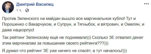 "Пришел на Варта на Банковой. Оказывается несмотря на заявки и согласования полиция оттеснила протестующих и разобрала и выбросила сцену. Палатки не пропускают, блокирует УГО. Как и 2013 году власть Януковича, власть Зеленского боится мирных собраний.