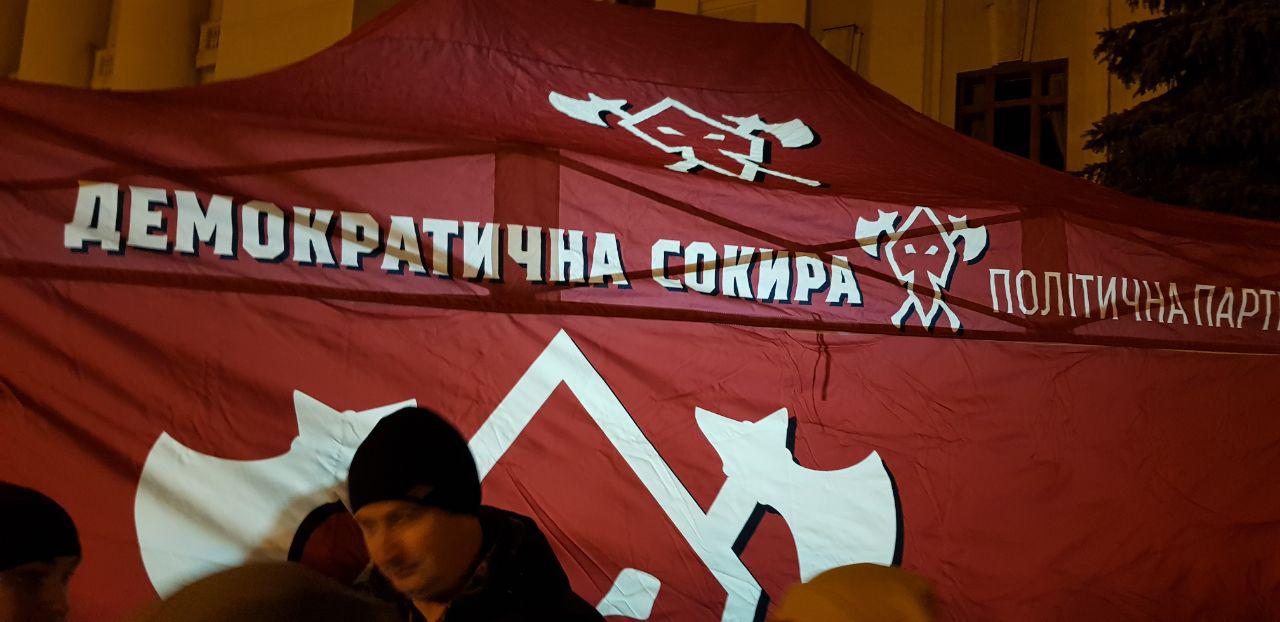 На палатках нанесены логотипы "Неизвестный патриот" и "Демократический топор".