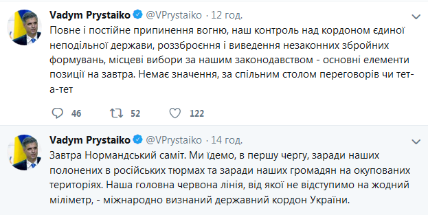 "...Нормандский саммит. Мы едем, в первую очередь, ради наших пленных в российских тюрьмах и ради наших граждан на оккупированных территориях. Наша главная красная линия, от которой не отступим ни на один миллиметр, - международно признанная государственная граница Украины", - написал Вадим Пристайко.