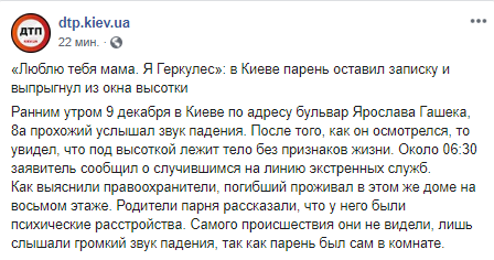 "Люблю тебя мама. Я Геркулес". В Киеве парень выпрыгнул из окна, оставив странную записку
