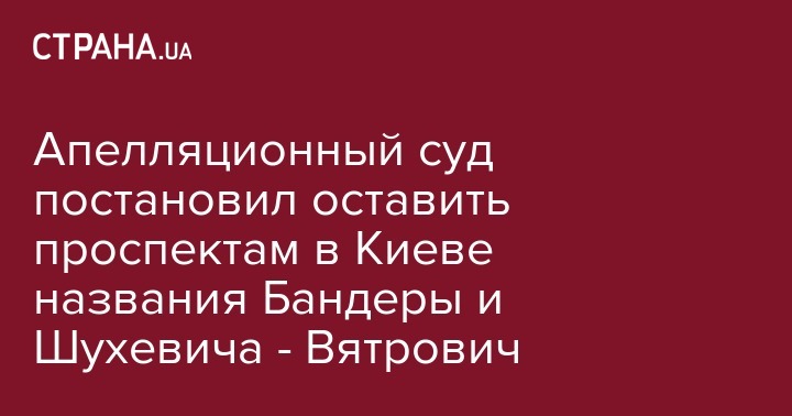 Шестой апелляционный суд Киева оставил в силе решения Киевского горсовета о переименовании Московского проспекта в проспект Степана Бандеры и проспекта Генерала Ватутина в проспект Романа Шухевича, сообщил народный депутат Владимир Вятрович на своей странице в Facebook.