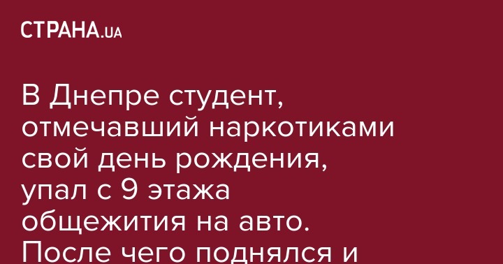 В Днепре студент, отмечавший наркотиками свой день рождения, упал с 9 этажа общежития на авто. После чего поднялся и решил вернуться отмечать дальше
