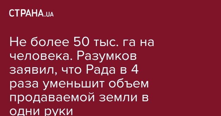 "Вопрос концентрации земли в одних руках в одном предприятии - между первым и вторым чтением эта цифра будет существенно уменьшена. Точно не могу сказать, о какой цифре идет речь, дискуссии идут - около 50 тыс. гектар в одни руки. Это более чем в 4 раза уменьшение от той позиции, которая была предложена ранее", - сказал Разумков.
