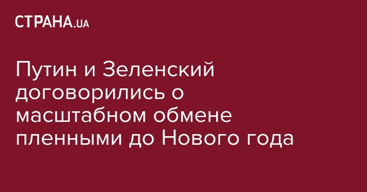Президент России Владимир Путин и президент Украины Владимир Зеленский предварительно договорились провести обмен пленными до 31 декабря. Об этом говорится в сообщении Telegram-канала Инсайдер UA.