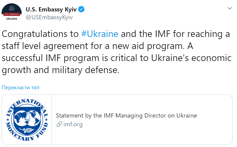 Посольство США в Украине поздравило МВФ и Киев с достижением договоренностей относительно новой кредитной программы.