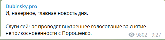 "И, наверное, главная новость дня. "Слуги сейчас" проводят внутреннее голосование за снятие неприкосновенности с Порошенко", - написал Александр Дубинский.