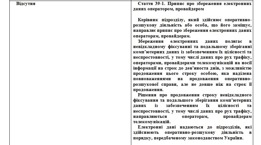 Как сообщается, представитель Национальной полиции Украины в рабочей группе предлагал в основные термины законопроекта ввести понятие "предписание" как "обязательное к исполнению письменное требование подразделений, осуществляющих оперативно-розыскную деятельность, которое предоставляется операторам, провайдерам телекоммуникаций с целью сохранения информации в цифровой (электронной) форме".