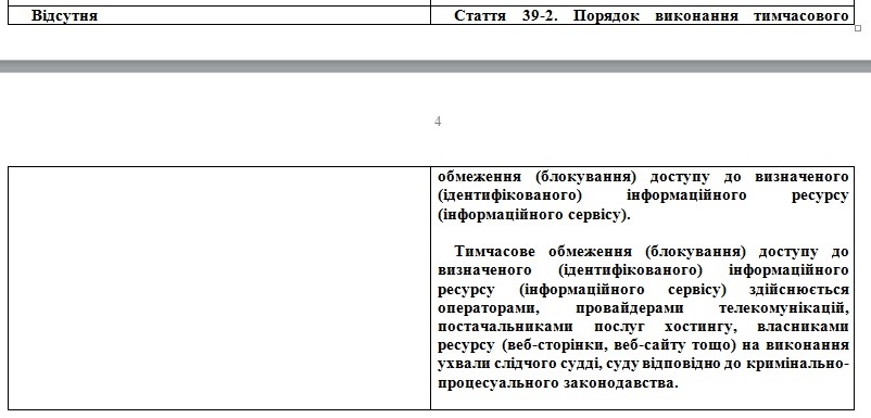 Кроме того, согласно документам, в полиции также хотят ввести статью о блокировке сайтов. Предлагаемая статья с названием "Порядок выполнения временного ограничения (блокировки) доступа к определенному (идентифицированному) информационному ресурсу (информационному сервису" предполагает, что временное ограничение (блокировка) доступа к определенному (идентифицированному) информационному ресурсу (информационному сервису) "осуществляется операторами, провайдерами телекоммуникаций, поставщиками услуг хостинга, владельцами ресурса (веб-страницы, веб-сайта и т.д.) во исполнение постановления следственного судьи, суда в соответствии с уголовно-процессуальным законодательством".