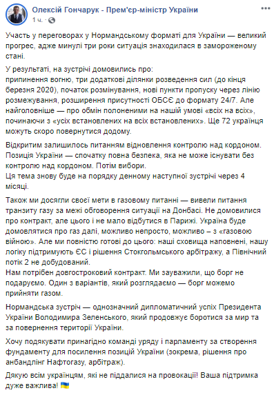 "Украина будет продолжать договариваться о газе дальше, возможно, непросто, возможно, с "газовой войной". Но мы полностью к этому готовы: наши хранилища наполнены, нашу логику поддерживают ЕС и решение Стокгольмского арбитража, а "Северный поток-2" недостроен", - написал Гончарук.