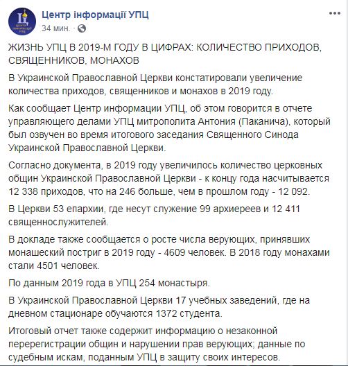 Прирост произошел несмотря на захваты храмов и незаконные перерегистрации общин. Сейчас в 53 епархиях УПЦ служат 99 архиереев и 12 411 священнослужителей. В монастырях подвизаются 4 609 монашествующих (на 108 больше, чем годом ранее).