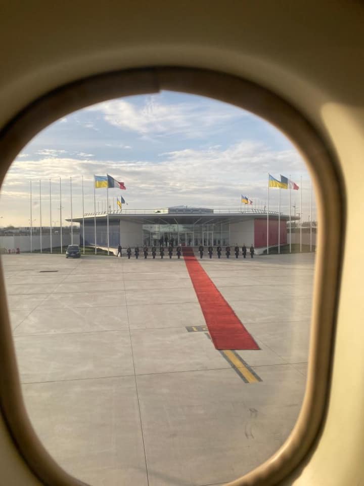 Зеленский опубликовал фото из окна иллюминатора самолета во французском аэропорту, где его провожал почетный караул и красная дорожка, которая на снимке выглядит как большая "красная линия".