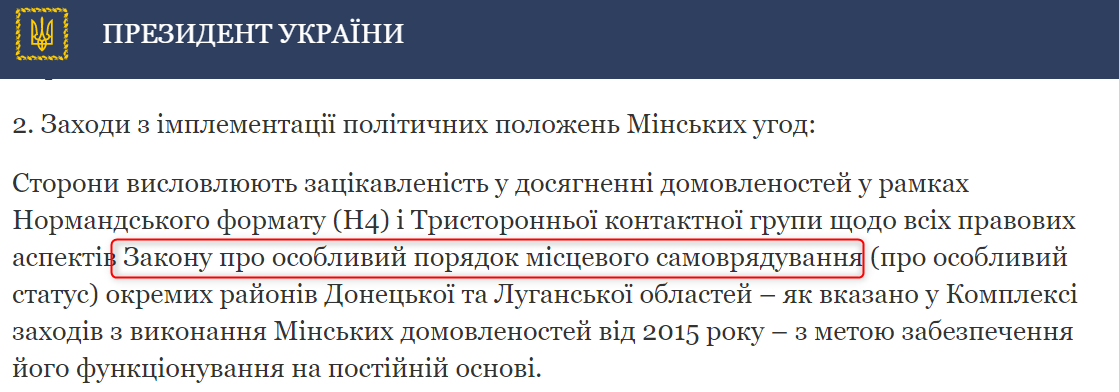 "Сторони висловлюють зацікавленість у досягненні домовленостей у рамках Нормандського формату (Н4) і Тристоронньої контактної групи щодо всіх правових аспектів Закону про особливий порядок місцевого самоврядування (про особливий статус) окремих районів Донецької та Луганської областей – як вказано у Комплексі заходів з виконання Мінських домовленостей від 2015 року – з метою забезпечення його функціонування на постійній основі".