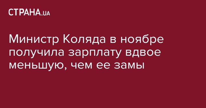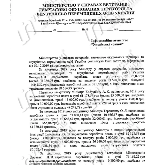 Министр по вопросам ветеранов, временно оккупированных территорий и внутренне перемещенных лиц Оксана Коляда в ноябре получила зарплату в 23 тысячи гривен, ее заместители - от 54 000 до 62 300 тысяч гривен, государственный секретарь министерства - 76 000 гривен.