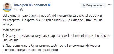 "Все выплаты - зарплаты и премии, которые я получил за 3 месяца работы в Министерстве. На фото. 93122 грн в целом, что составляет 31041 грн в месяц", - написал он, прикрепив соответствующие скриншоты.