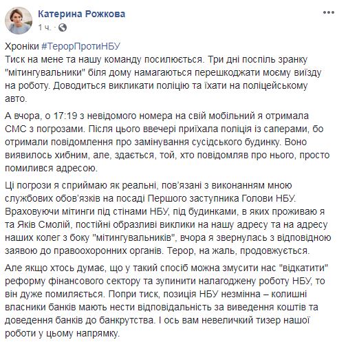 Первый заместитель главы Нацбанка Екатерина Рожкова заявила, что начала получать СМС с угрозами, которые воспринимает как реальные и связанные с ее работой. Об этом Рожкова написала в Facebook.