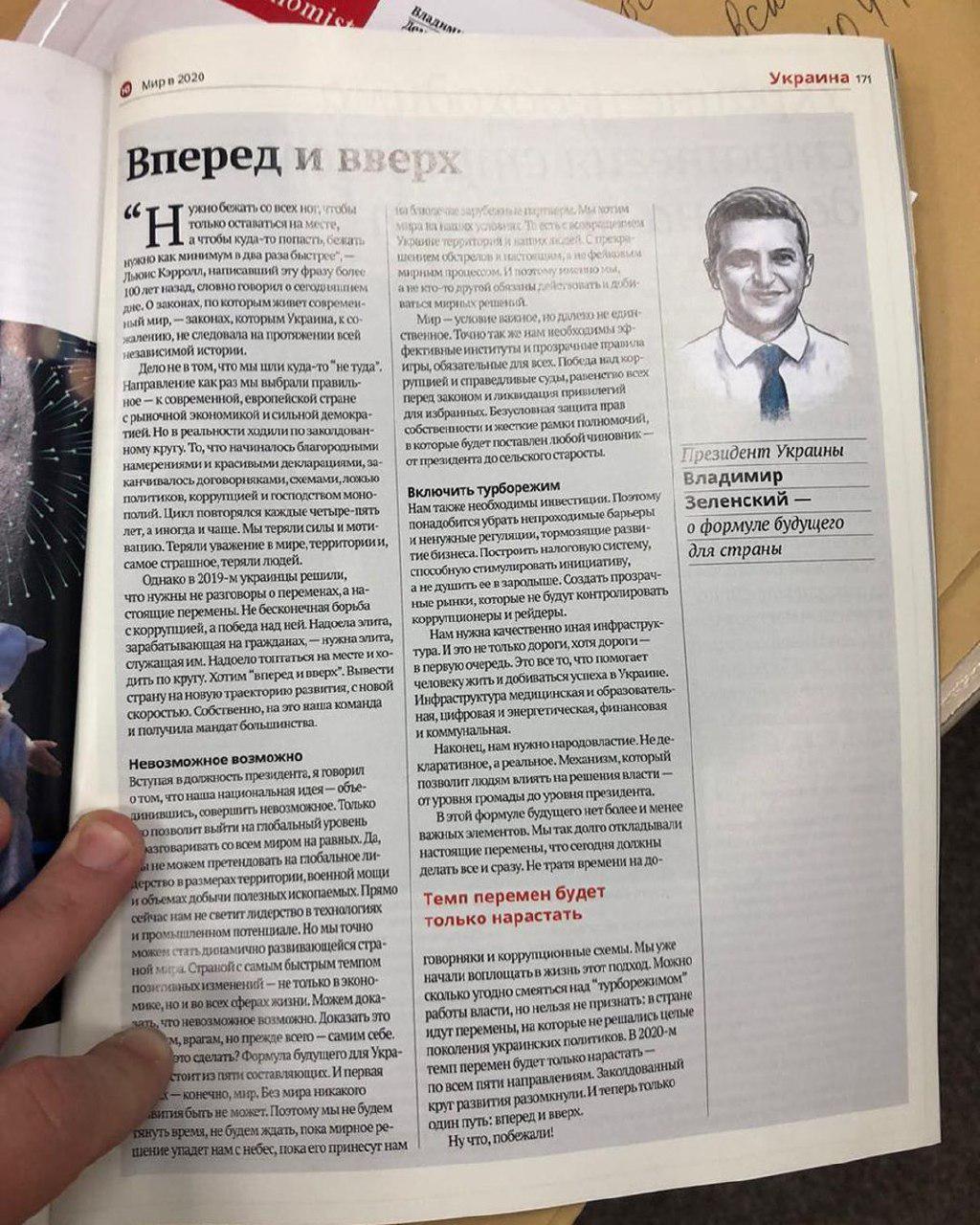 "Первая колонка Зеленского! "Вперёд и вверх": формула будущего для Украины "Нужно бежать со всех ног, чтобы только оставаться на месте, а чтобы куда-то попасть, надо бежать как минимум в два раза быстрее" - Льюис Кэррол, написавший эту фразу более ста лет назад, как будто бы говорил о сегодняшнем дне. О законах, по которым живет современный мир – законах, которым Украина, к сожалению, не следовала на протяжении всей независимой истории", - цитирует Мендель первый абзац статьи.