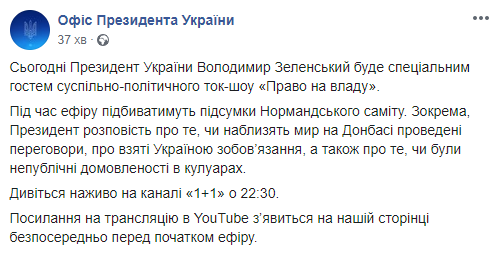 Сообщается, что во время эфира будут подведены итоги Нормандского саммита. В частности, президент расскажет о том, приблизят мир на Донбассе проведенные переговоры, о взятых Украиной обязательствах, а также о том, были ли непубличные договоренности в кулуарах.