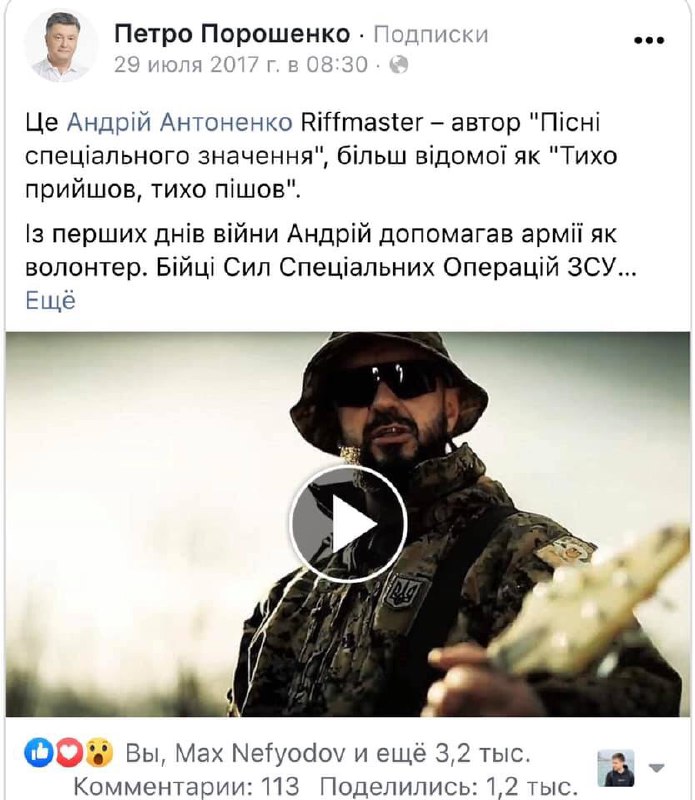Петр Порошенко, будучи президентом, в 2017 на своей странице в соцсети отметил заслуги украинского рок-музыканта Андрея Антоненко, известного под именем Riffmaster, которого подозревают в причастности к убийству журналиста Павла Шеремета.