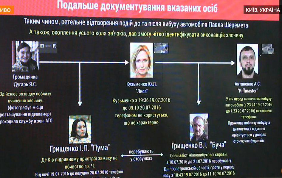 Инна Грищенко "Пума" - волонтер АТО, приобрела несколько автомобилей за время войны, решительна и целенаправленная, имеет явно выраженные лидерские качества в группе. Ее ДНК обнаружены в подрывном устройстве во время покушения на убийство гражданина Ч. С ночи 19 июля до полудня 20 июля также был выключен телефон.