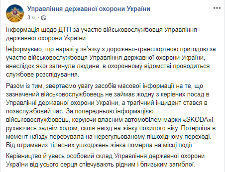 Информируем, что сейчас в связи с дорожно-транспортным происшествием с участием военнослужащего Управления государственной охраны Украины, в результате которого погиб человек, в охранном ведомстве проводится служебное расследование.