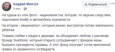 17:50 "На одном из этих фото - националистка, которая, по версии следствия, подложила бомбу в автомобиль журналиста. На втором - националист, который разнес выстрелом голову маленького ребенка.